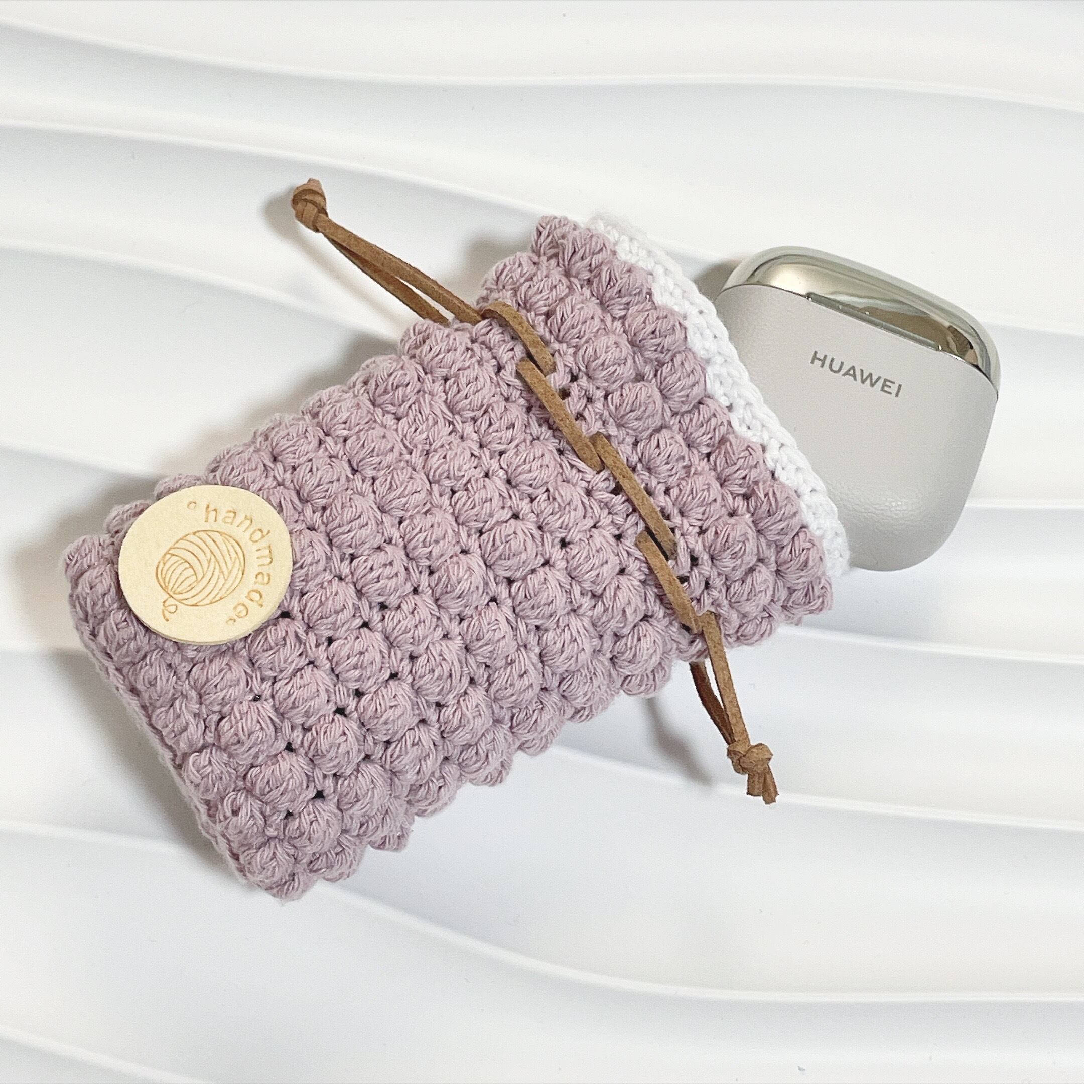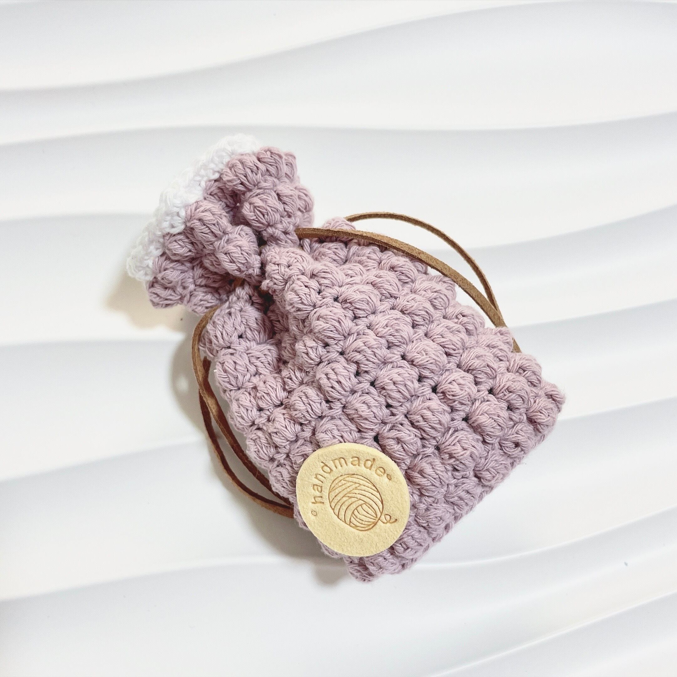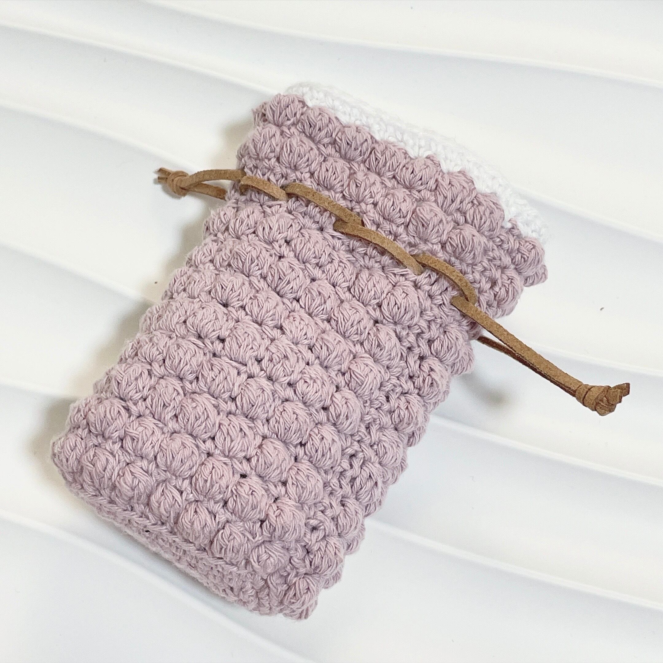 たま編みのころんと巾着|イヤホンケース・小物入れ|くすみラベンダーの手編みポーチ